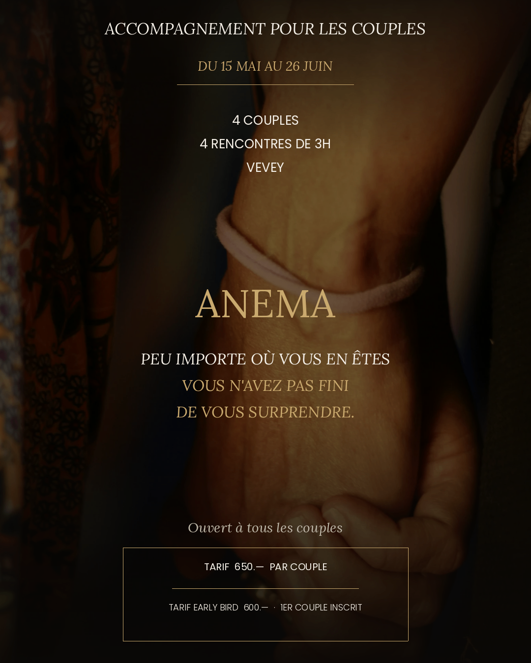 Un cycle d'accompagnement pour les couples Il existe des espaces pour les couples en crise. Mais pour ceux qui vont bien — qui veulent aller plus loin, se redécouvrir, se surprendre encore — il n'existe presque rien. ANEMA est né de cette évidence. Un cycle de 4 rencontres. Un chemin initiatique à deux. Pour aller là où le quotidien ne vous emmène jamais — dans le corps, dans ce qui se dit rarement, dans ce qui unit deux personnes au-delà des habitudes. Chaque session vous laisse quelque chose de concret à ramener dans votre vie. Pour qui ? Pour les couples qui s'aiment — et qui sentent qu'il y a encore quelque chose d'inexploré entre eux. Les détails 4 couples · 4 rencontres de 3h · Une fois par mois Vevey · Du 15 mai au 26 juin Les dates : 15 mai 29 mai 12 juin 26 juin 19h30- 22h30 Tarif 650.— par couple · Early bird 600.— pour le 1er couple inscrit